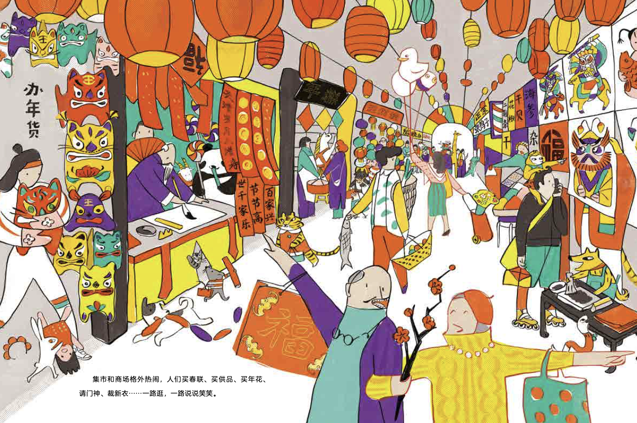 Full of cultural elements from classic texts and folk tales. Each picture contains events, images, and objects related to traditional customs, including the Kitchen God, the God of Wealth, the mandrill, and the panda stealing greens... Imaginative details for kids to read over and over again.